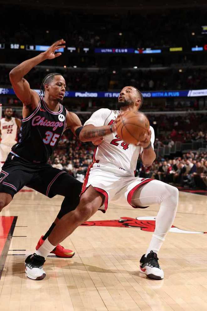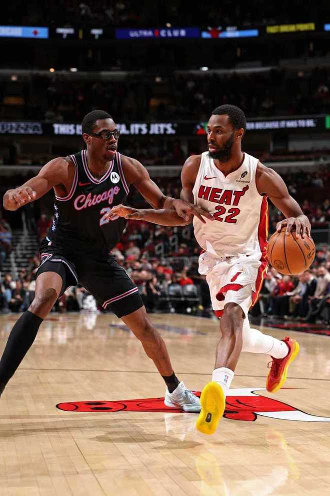 中场休息回来,公牛本场第二次单节得分30+,热火连续两节单节不足30分。热火借助团队攻势压制公牛,在前半节维持78-66领先优势,公牛连追4分。热火再度扩大83-72领先优势,公牛反扑追到个位数差距,热火单节29-34被追回5分,三节结束热火91-85领先公牛。前三节比赛双方均是5人得分上双,热火三分29中11,阿德巴约18+10与鲍威尔17分;公牛三分31中13,武切维奇13+8与赫尔特15+7。