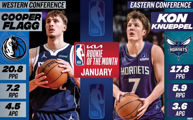 黄蜂的克努佩尔与独行侠的弗拉格分别当选1月东西部月最佳新秀。