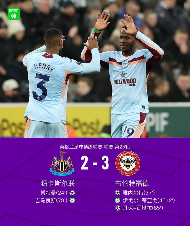 北京时间2月8日英格兰足球顶级联赛 联赛 第25轮,纽卡斯尔联主场对阵布伦特福德。纽卡斯尔联博特曼破门,吉马良斯破门。布伦特福德雅内尔特破门,丹戈-瓦塔拉破门,伊戈尔-蒂亚戈破门。最终比分纽卡斯尔联 2-3 布伦特福德。
