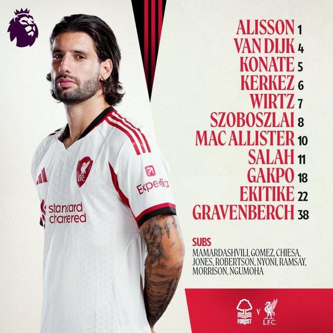 利物浦首发:1-阿利松、6-凯尔凯兹、4-范戴克、5-科纳特、8-索博斯洛伊、38-赫拉芬贝赫、10-麦卡利斯特、7-维尔茨、11-萨拉赫、18-加克波、22-埃基蒂克
