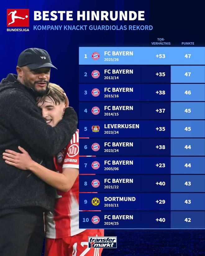 拜仁慕尼黑本赛季创下了德甲历史上半程最佳战绩纪录,德转列出了德甲历史上半场最佳战绩前十,拜仁独占八席,勒沃库森和多特各一席。